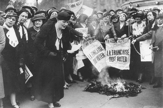 纵观全球范围内的妇女解放运动(women’s liberation movement; WLM)史,它无不伴随着一系列政治和社会变革,18世纪法国大革命带动了世界妇女运动的第一声,奥兰普·德古热(Olympe de Gouge)发表的《女性与女性公民权宣言》成为第一份要求妇女权利的宣言,而她在此不久后被送上了断头台,妇女运动在法国大革命后的一百年时间里都举步维艰。19世纪中叶,英国的工业革命使得更多女性能够参与进劳动生产和社会活动中,加之由法国大革命孕育而生的女性主义观念,都在很大程度上推动了“女性参政权”运动(women’s suffrage),并在第一次世界大战后推广至全世界。对妇女参政、投票以及其他基本权利的争取构成了第一波女性主义浪潮(first-wave feminism),亦即“女权运动”的开端,为此后1960年代起兴盛的更为全面且激烈的女性主义思潮奠定了根基。