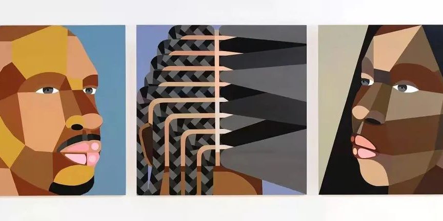德里克·亚当斯,《被看见(头脑对话)》,2021年,纸面丙烯与织物拼贴在木板上,三联,每联152.2 x 152.2厘米。Longlati基金会收藏。图片由艺术家与纽约Salon 94提供